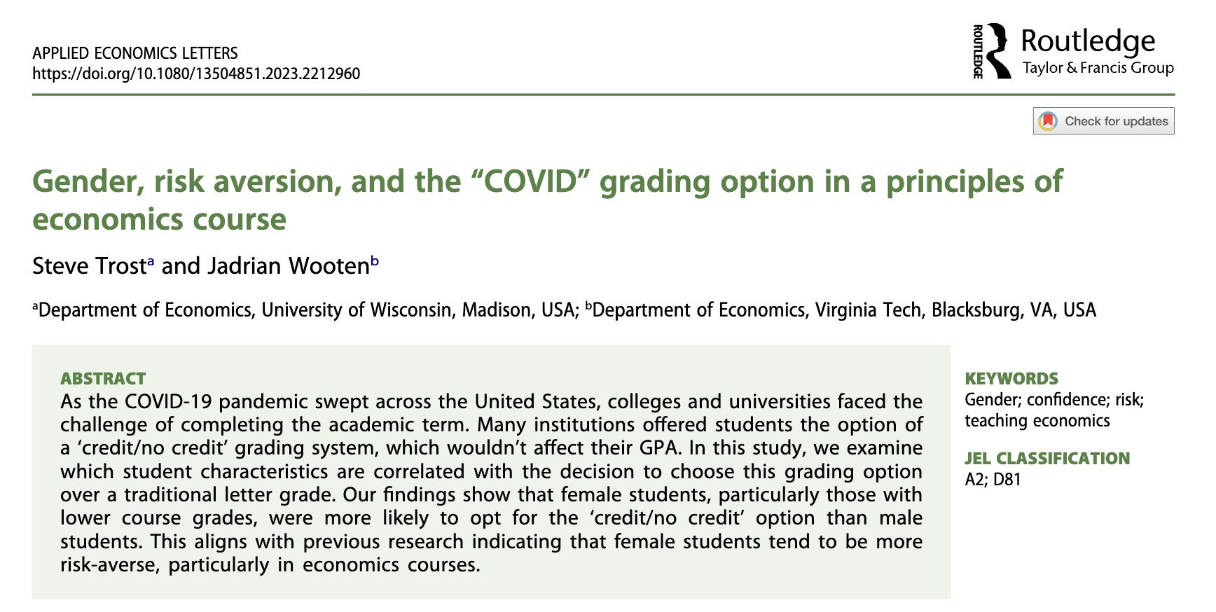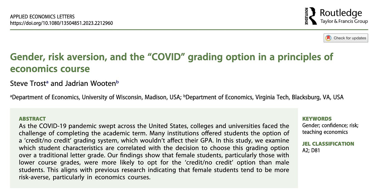 One of the research topics for this episode is based on recently published work by Jadrian and Steve Trost. The two looked at how students behaved during the pandemic when they were faced with the pass-fail decision at the end of the term. Students knew their course average going into the final exam, but had to decide before taking the final exam whether they wanted to “hide” their letter grade with a Pass/Fail option. We were focused on gender differences in that decision and largely found that female students were significantly more likely than male students to “hide” their letter grade when their average grade going into the final was at a C level: