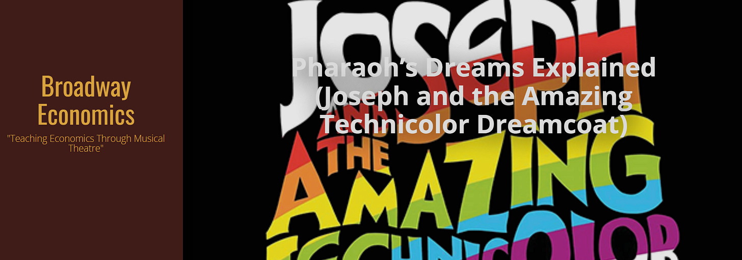 While the entire episode talked about different movies and TV shows that highlight the stories we discussed, we did mention briefly that some of the scenes are available on BroadwayEconomics.com. In this episode, Matt discussed the song “Pharoah’s Dreams Explained” from Joseph and the Amazing Technicolor Dreamcoat. The scene discusses business cycles and can be used to teach about economic cycles. You can watch it here: