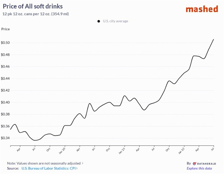 Even though the theme of the episode was recessions, we also touched on inflation for a bit. Matt commented on the increasing price of sodas, and how his family has definitely seen the effects. Jadrian hasn’t noticed, but Matt’s family drinks way more soda. Thanks to Mashed, we can actually see just how much soda prices have increased over the past few years.