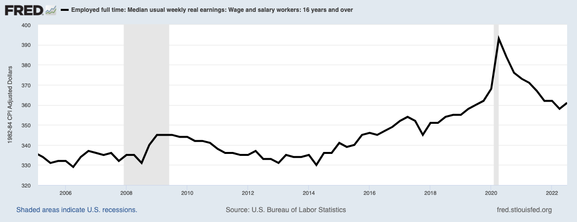 Typically these downturns are marked by higher levels of unemployment. This past year has been so strange because we have seen GDP drop but incredibly low unemployment. Instead, real wages are down about 3% for the average worker.