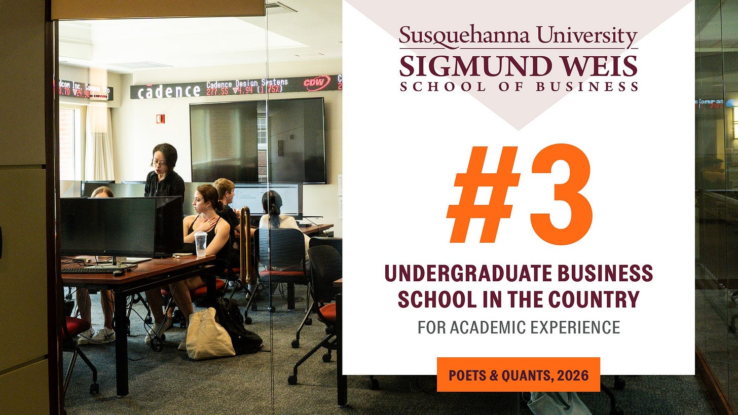 Spring break might be over, but the drinks still feel like spring. Jadrian is trying a Sam Adams Blackberry Wheat Beer from a new variety pack, and Matt is pouring a Kalik from his recent cruise to the Bahamas. It’s a fitting way to celebrate some big news: Susquehanna has been ranked third in the country for undergraduate business experience by Poets & Quants.