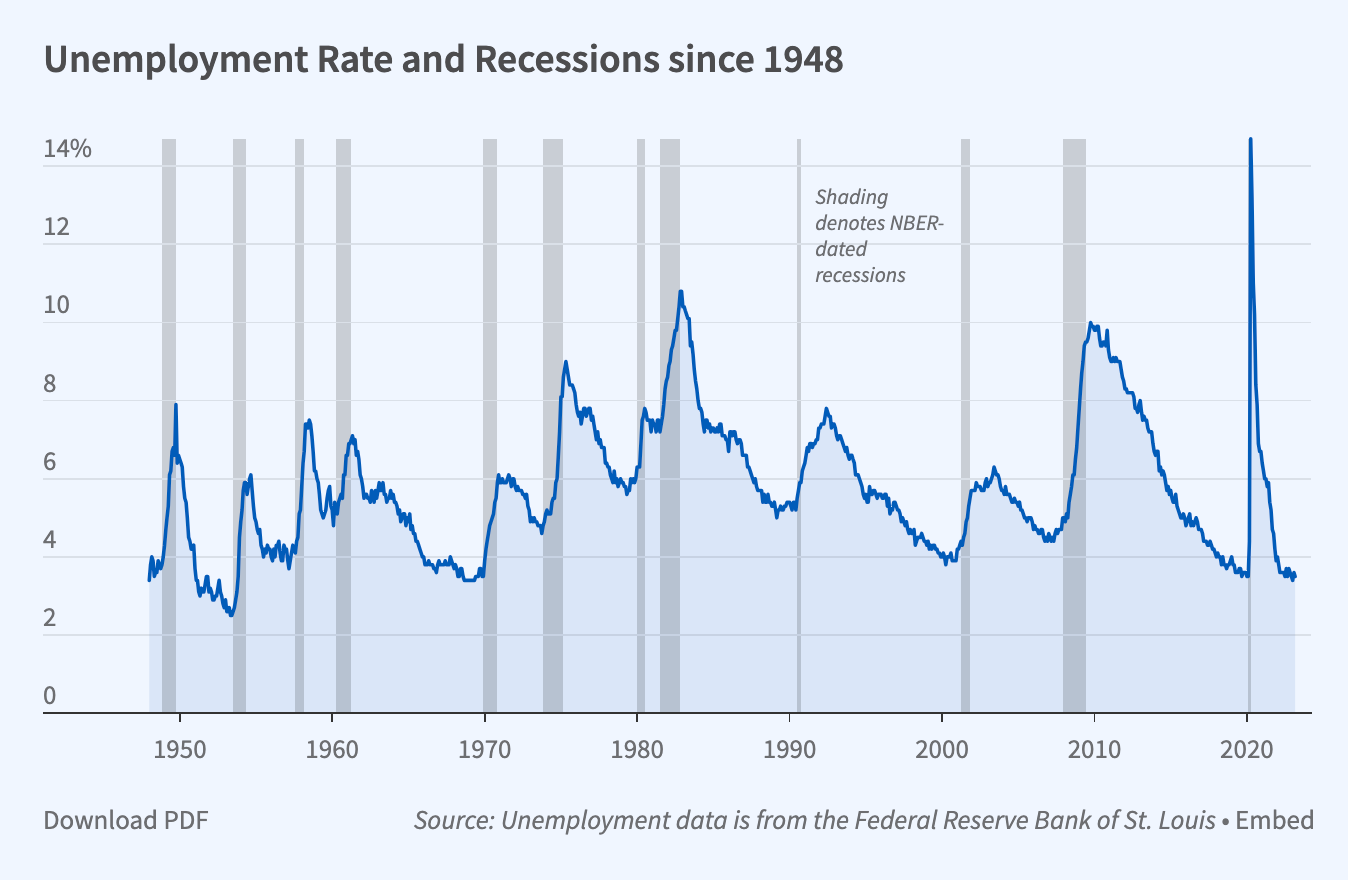 We also spent some time talking about recessions and expansions, but it’s worth sharing the NBER’s chart to highlight those periods. The chart below shows the unemployment rate since 1948, with recessions shaded in gray. You can check the NBER’s estimated business cycle dates going back to 1857!